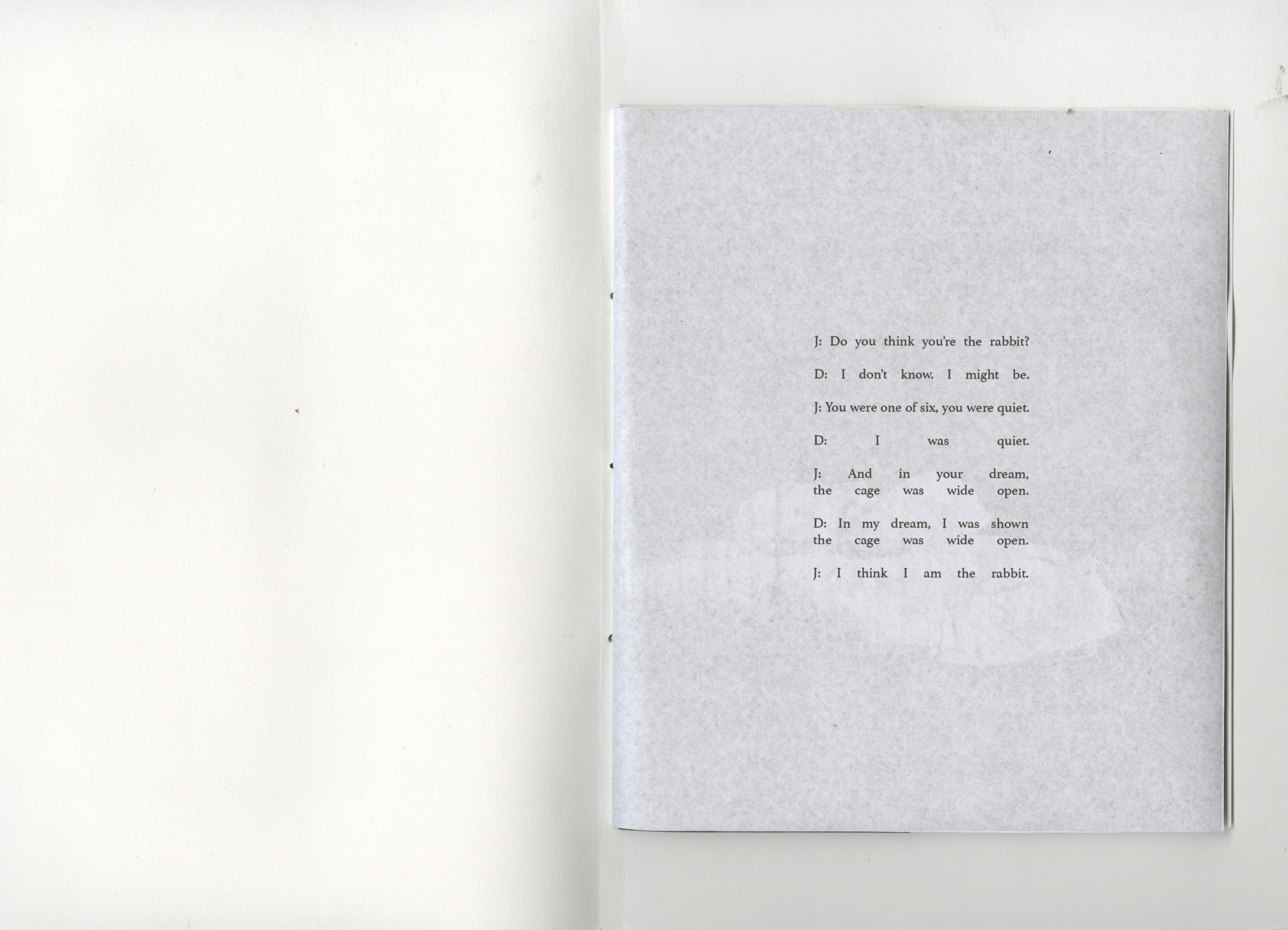 J: I came across an old notebook where I wrote that I do not particularly like rabbits, but absolutely hate they way they look when they are hurt. I am not drawn to rabbits, but they’re kind of the last thing I want to see suffer.
