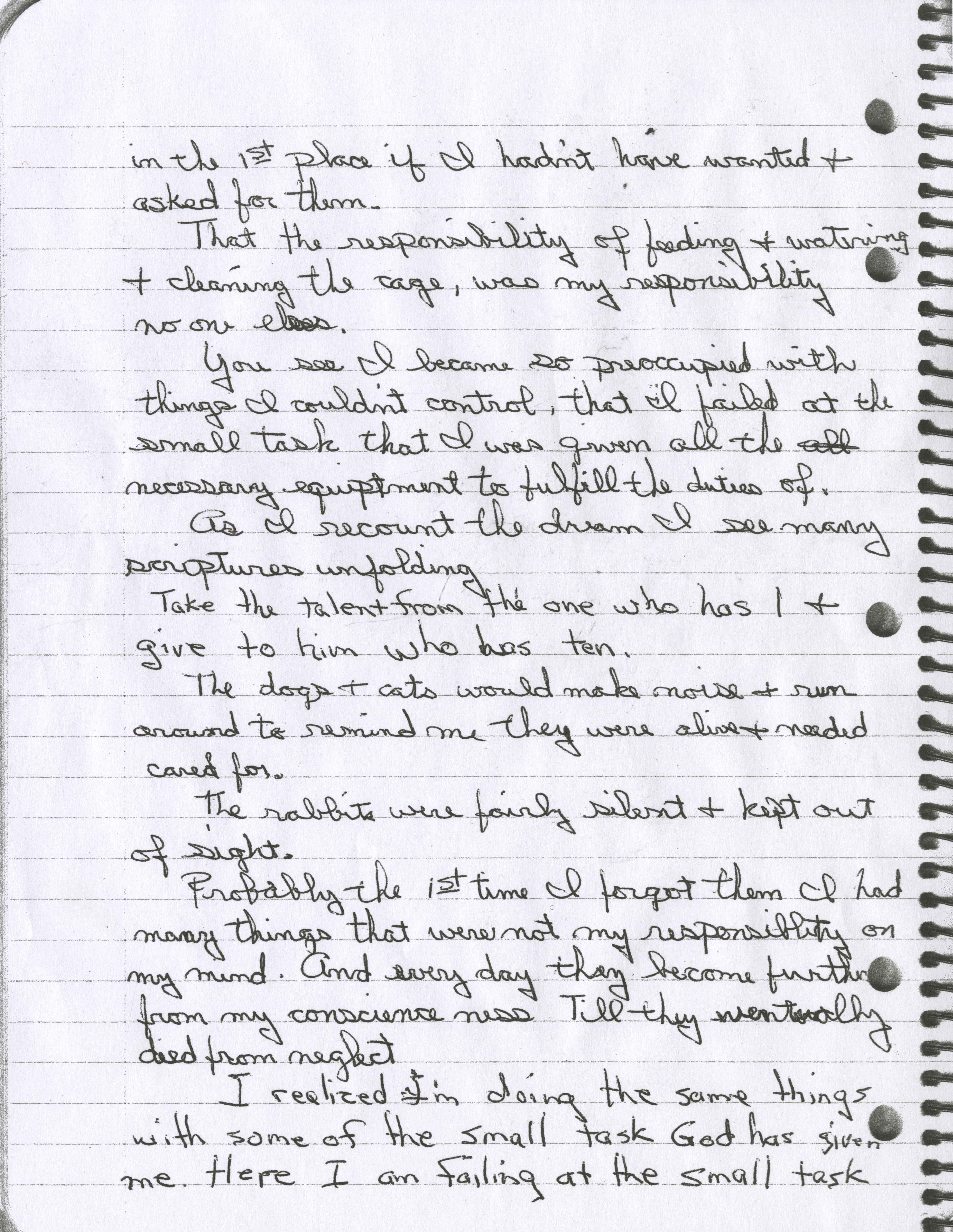 Even though to some people that might be a really stupid thing, its not to me. When we neglect our own responsibilities in life, it is not a small thing. Looking for this notebook today, I am looking at our stuff, and I am so careful about what I gather, because, to me, whatever it is: material, if it is a book, you have to find a place for it you have to dust it, it has a spot in your life. Do you really want to add it to your life, whatever it is? It might look like a beautiful little mini bike to a kid, but it isn’t just to make you happy. It gonna break down, it needs gas, it needs oil, it needs its chain adjusted.