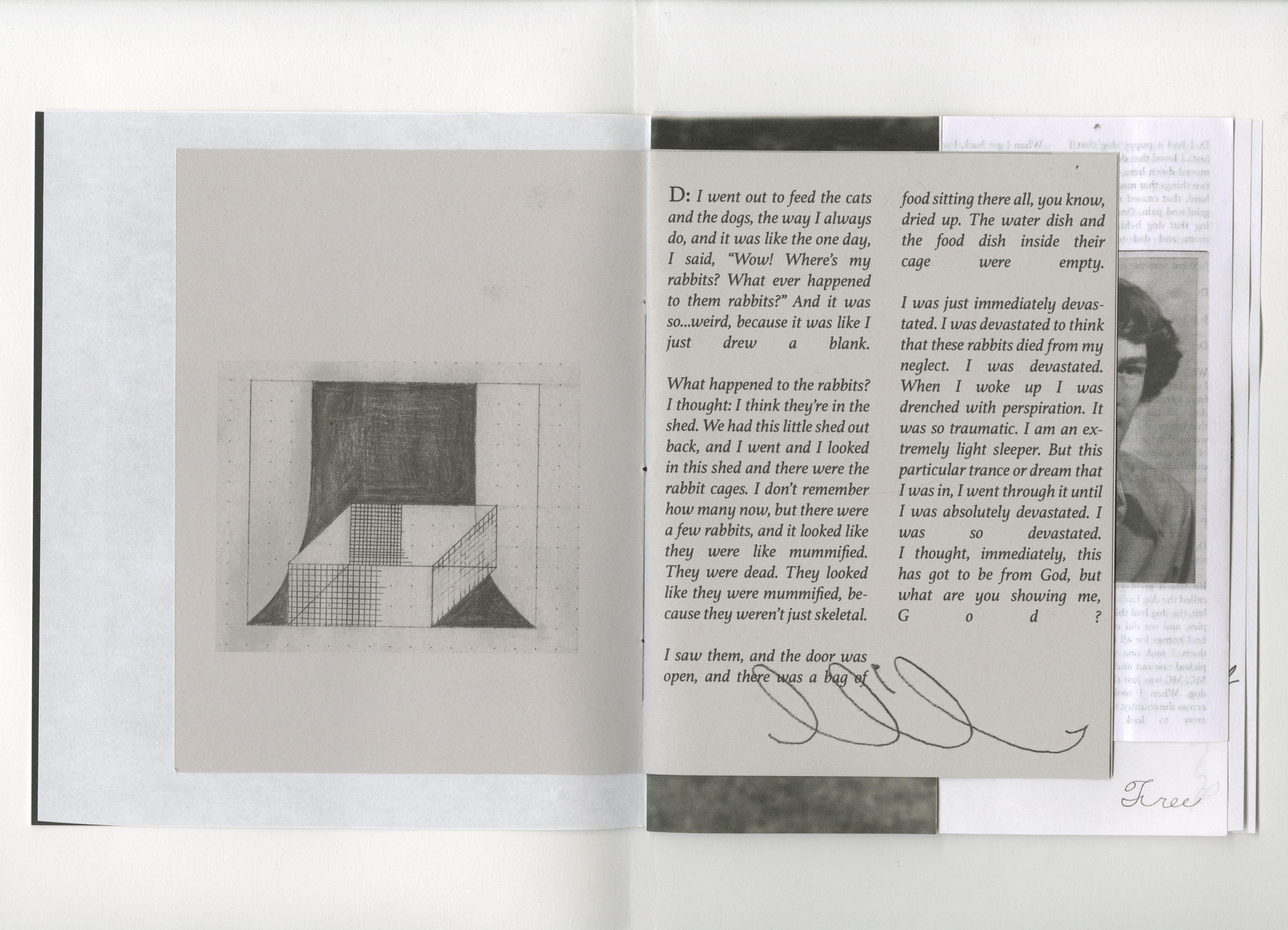 This is an open (mammoth) project that currently takes form as a complex-bound book which holds a multi-voice textual component, archival and fine art photographs, drawings, and re-appropriated cursive practice.